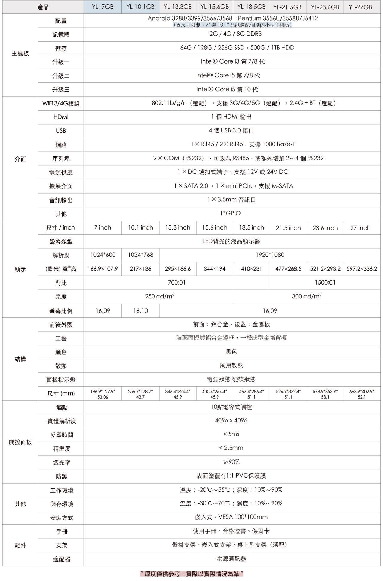 - 可選配 500 / 700 / 1000 nits 高亮度觸控螢幕