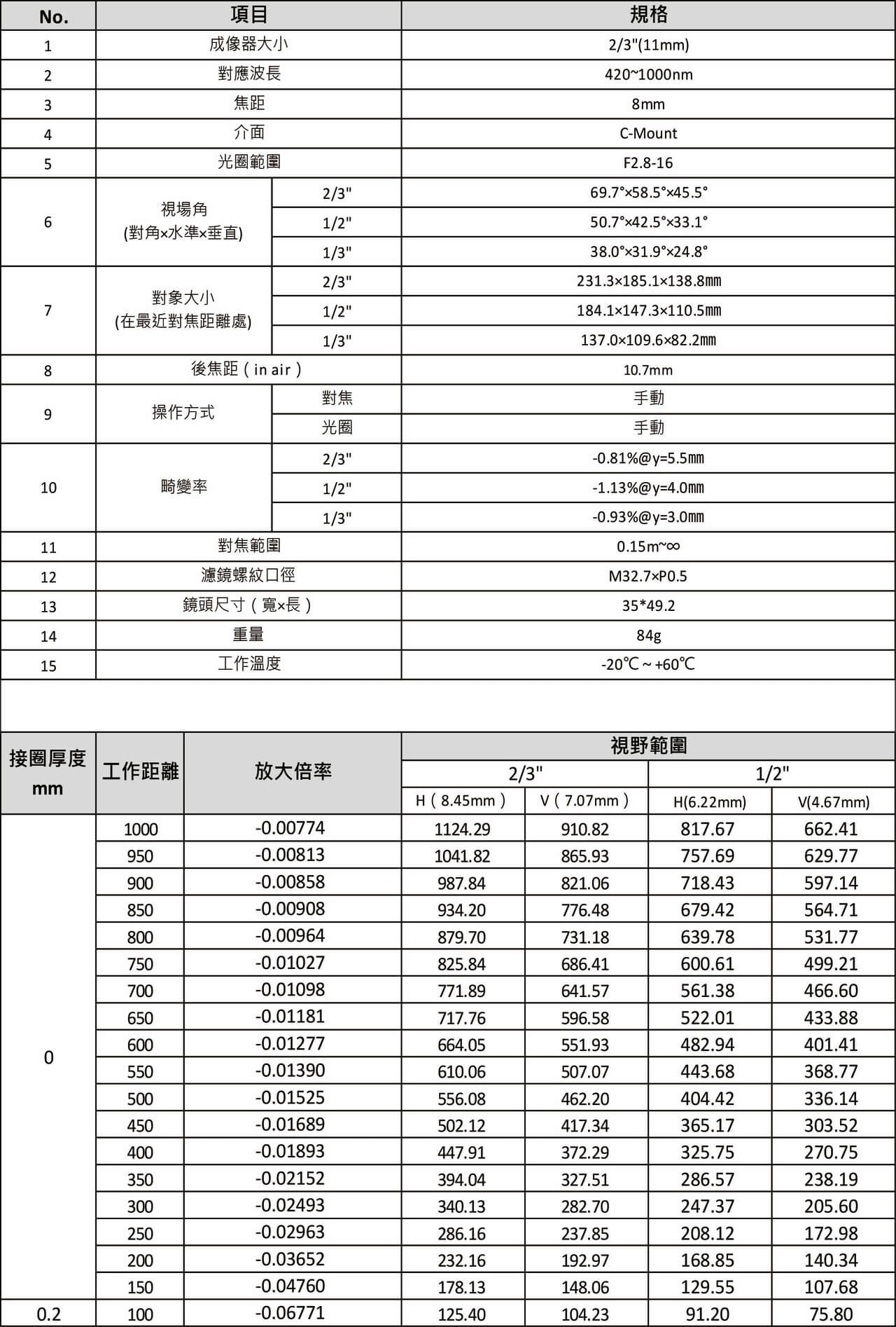 YL2808 10MP 2/3″ 8mm FA鏡頭