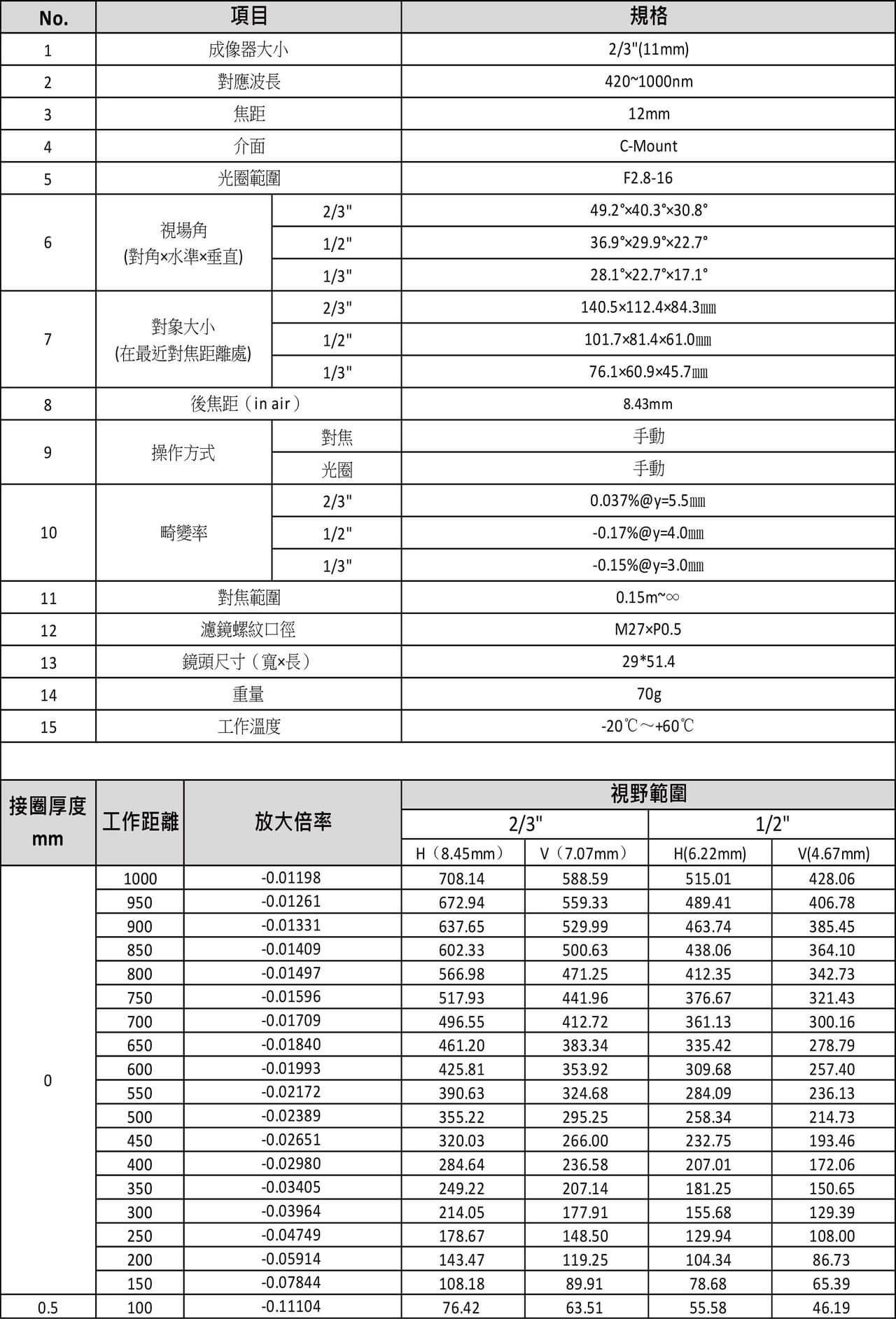 YL2812 10MP 2/3″ 12mm FA鏡頭