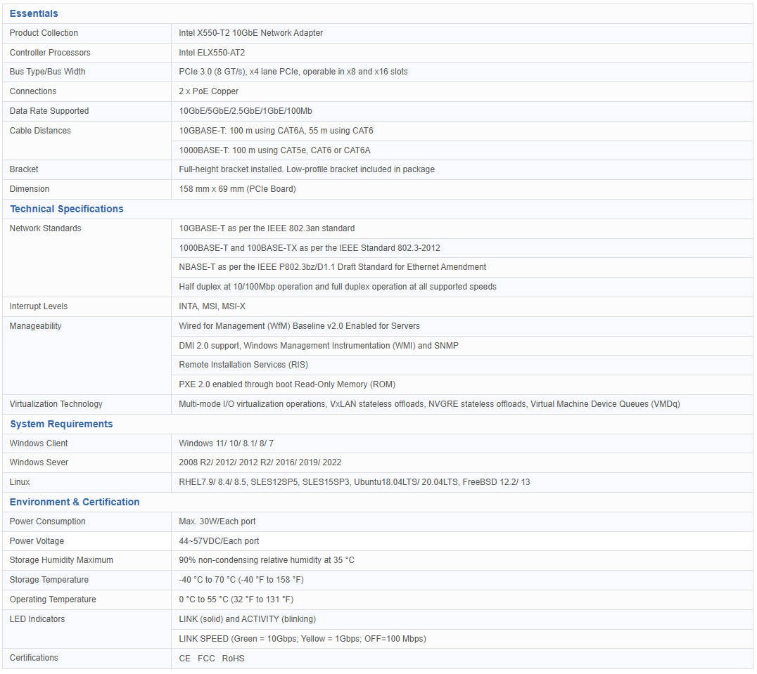 - 英特爾第二代單一連接埠和雙埠 10GBASE-T 控制器,整合 MAC 和 PHY。