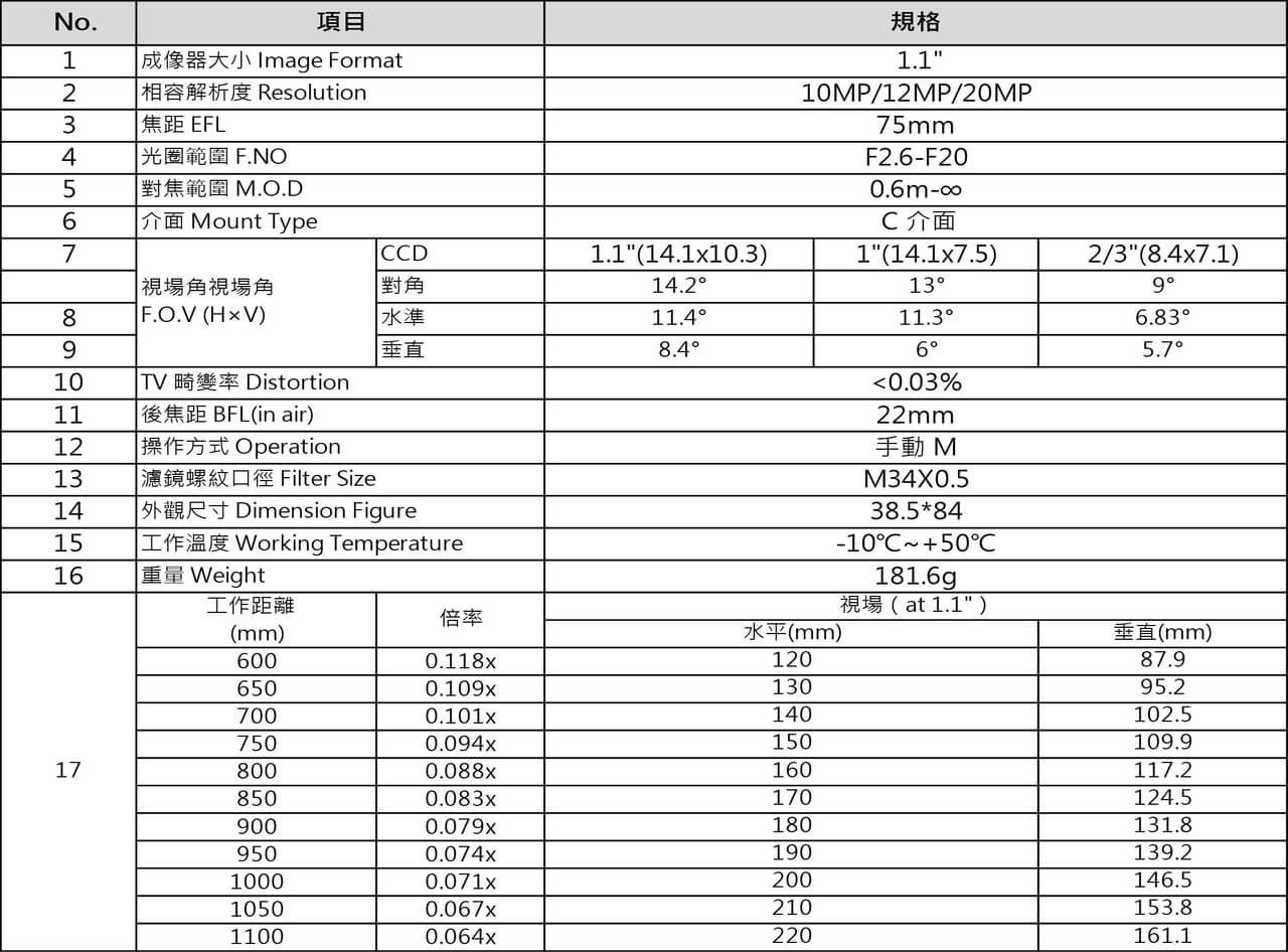 YL2675 20MP 1.1″ 75mm FA鏡頭