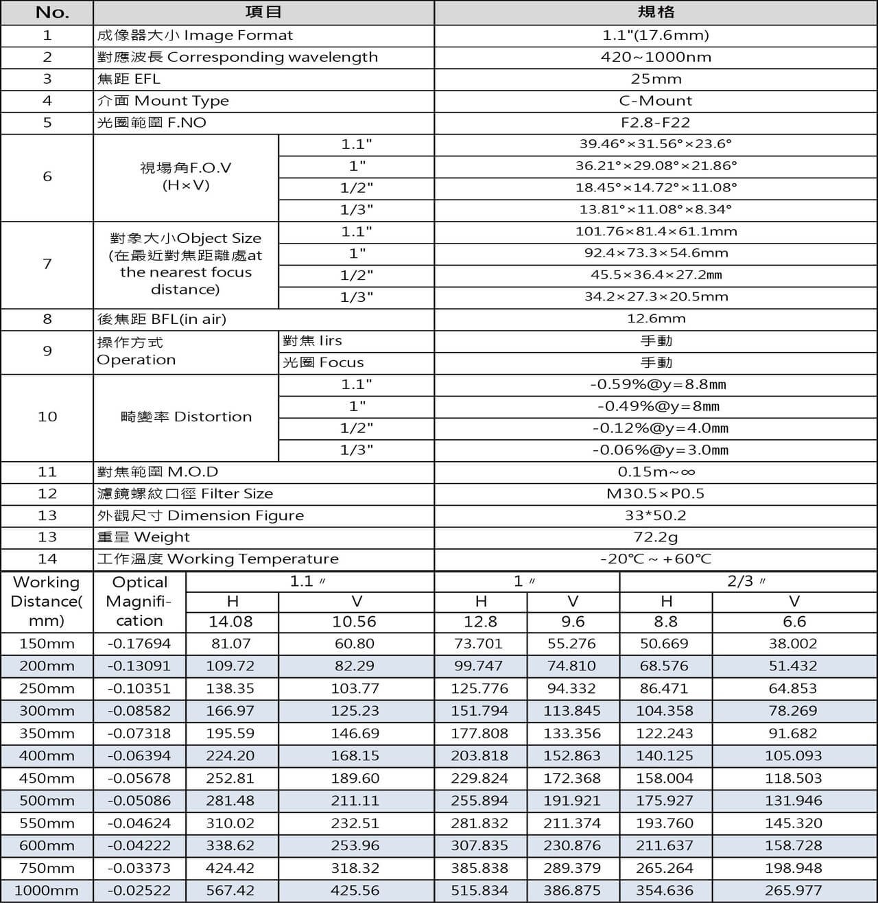 YL2825 20MP 1.1″ 25mm FA鏡頭